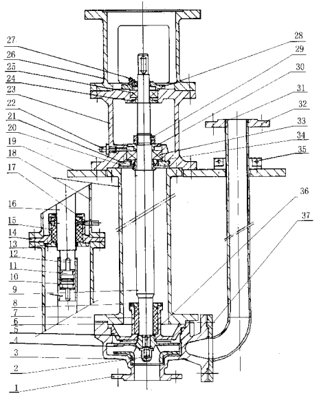 1、 泵體    2、葉輪螺母    3、葉輪    4、墊片    5、泵蓋    6、立柱管    7、導(dǎo)軸管    8、導(dǎo)軸承蓋    9、泵軸    10、傳動(dòng)套    11、聯(lián)接管    12、鍵    13、中間導(dǎo)軸承壓蓋    14、中間導(dǎo)軸承座    15、中間導(dǎo)軸承    16、泵軸    17、潤滑液管路    18、立柱管    19、支承座    20、甩液套    21、下軸承壓蓋    22、黃油杯    23、軸承座    24、上軸承檔圖    25、軸承    26、電機(jī)座    27、黃油杯    28、上軸承壓蓋    29、鎖緊螺母    30、下軸承擋圈    31、出液管    32、出液口法蘭    33、軸承    34、油封    35、對(duì)半法蘭    36、鍵    37、墊片    38、下軸承壓蓋