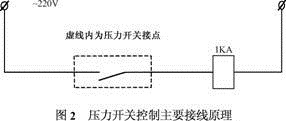 壓力開關(guān)操控首要由壓力開關(guān)、中心繼電器、操控 線等組成,其首要接線原理見圖2。