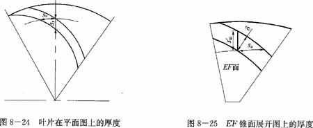 用一個(gè)垂直軸面截線(xiàn)的EF線(xiàn)(圖8-23)為母線(xiàn)的錐面去截葉片,并展開(kāi)在平面上(圖8-25)。因?yàn)樵撁娲怪比~片上的線(xiàn)(軸面截線(xiàn)),所以其上反映葉片的真實(shí)厚度δ,由此圓錐面上的圓周方向的厚度應(yīng)等于流面上的圓周厚度,由圖8-25