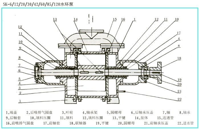 水環(huán)泵的泵體、兩個(gè)端蓋、葉輪、軸等部件級成。進(jìn)氣管和排氣管通過安裝在端蓋上的園盤上的吸氣孔和排氣孔與泵腔相連,軸偏心地安裝在泵體中,葉輪用平鍵固定在軸上。泵兩端面的總間隙由泵體和園盤之間的墊來調(diào)整,葉輪與端蓋上的園盤之間的間隙由軸套(SK-1.5/3/6)或背帽(SK-12/20/30)推動(dòng)葉輪來調(diào)整,而SK-42以上軸與葉輪為過盈配合,此間隙由前端定位時(shí)確定,SK-42/60/85/120無軸套,其余結(jié)構(gòu)與SK-6/12/30相同。葉輪兩端面與端蓋園盤的間隙決定氣休在泵腔內(nèi)由進(jìn)氣口至排氣口流動(dòng)中損失的大小及其極限壓力。