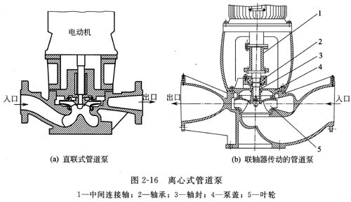 圖2-1 6(a)為直聯(lián)式管道泵。圖2—1 6(b)所示管道泵,以帶有中間連接軸的聯(lián)軸器傳動,在不必拆卸管線和拆除電動機的情況下,即可取出轉(zhuǎn)子組(包括葉輪、泵軸、軸承和軸封等)進行檢修,更適合化工生產(chǎn)特別是大型化工裝置應用,加之管道泵占地面積小的優(yōu)點,如按離心式化工流程泵的標準和規(guī)范設計、制造和檢驗,可發(fā)展成管道式化工流程泵。