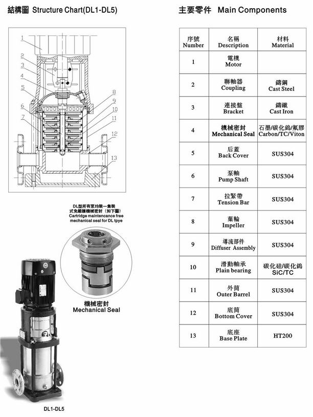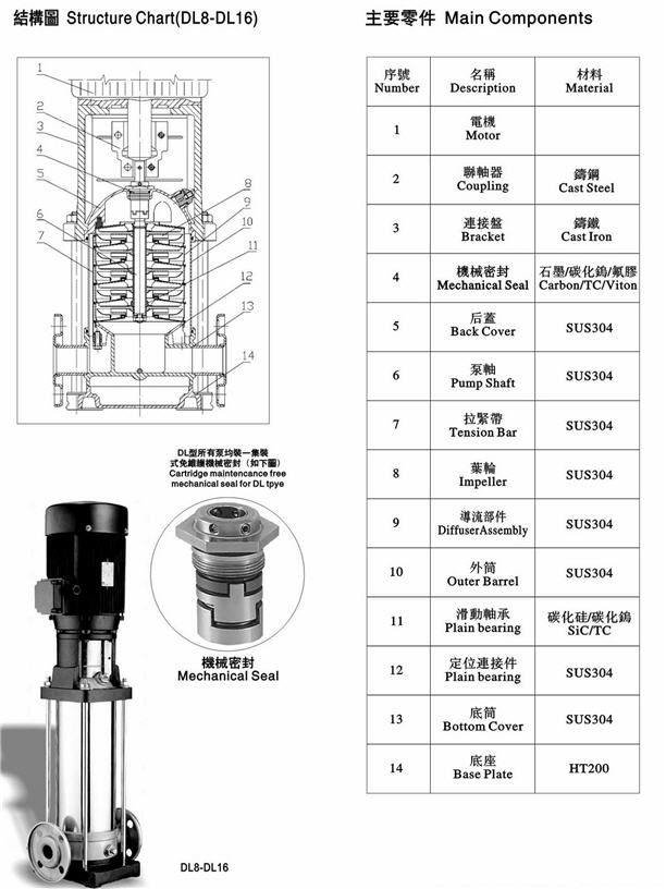 泵殼、葉輪、后蓋、泵軸及導流部件:SUS304或 SUS316L