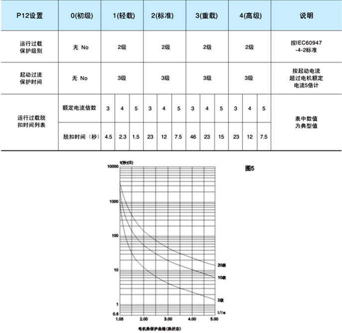 ◆ 輕載、標(biāo)準(zhǔn)、重載三個(gè)保護(hù)級(jí)別具備完全的保護(hù)功能,區(qū)別在于電機(jī)過載熱保護(hù)時(shí)間曲