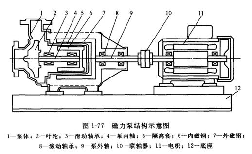 磁力傳動在離心泵上的應用與一切磁傳動原理一樣,是利用磁體能吸引鐵磁物質(zhì)以及磁體或磁場之間有磁力作用的特性,而非鐵磁物質(zhì)不影響或很少影響磁力的大小,因此可以無接觸地透過非磁導體(隔離套)進行動力傳輸,這種傳動裝置稱為磁性聯(lián)軸器.如圖1-77所示,磁力泵主要由泵體、葉輪、內(nèi)磁鋼、外磁鋼、隔離套、泵內(nèi)軸、泵外軸、滑動軸承、滾動軸承、聯(lián)軸器、電機、底座等組成(有些小型的磁力泵,將外磁鋼與電機軸直接連在一起.省去泵外軸、滾動軸承和聯(lián)軸器等部件)。電動機通過聯(lián)軸器和外磁鋼連在一起,葉輪和內(nèi)磁鋼連在一起。在外磁鋼和內(nèi)磁鋼之間設有全密封的隔離套,將內(nèi)、外磁鋼完全隔開.使內(nèi)磁鋼處于介質(zhì)之中,電動機的轉(zhuǎn)軸通過磁鋼間磁極的吸力直接帶動葉輪同步轉(zhuǎn)動。