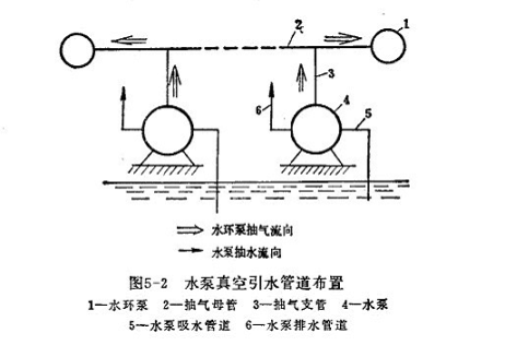 如果泵站中有兩臺(tái)以上的水泵,則可將水環(huán)式真空泵進(jìn)氣管與抽氣母管相通,每臺(tái)泵的泵殼頂部通過抽氣支管與抽氣母管相連。在每個(gè)支管上都安裝一個(gè)閥門,以便可以單獨(dú)對(duì)每一臺(tái)泵抽氣。有時(shí),為了備用起見,可以設(shè)置兩臺(tái)水環(huán)式真空泵,每一臺(tái)的進(jìn)氣管上都安上閥門。當(dāng)一臺(tái)發(fā)生故障時(shí),可以關(guān)閉該泵上的進(jìn)氣閥門,利用另外一臺(tái)抽氣,不致耽誤水泵的起動(dòng)。正常情況下兩臺(tái)水環(huán)式真空泵可對(duì)水泵同時(shí)抽氣,以加快引水速度。整個(gè)管路布置如圖5-2所示。