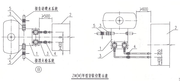 3.本設(shè)備供消防栓和自動噴水兩套系統(tǒng)共用時,在其出水管上設(shè)閥門分別與兩系統(tǒng)連接,見圖B所示