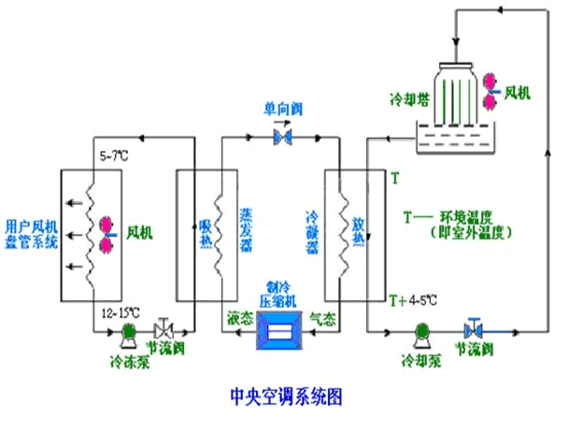 1、冷凍機組:通往各個房間的循環(huán)水由冷凍機組進行“內(nèi)部熱交換”作用,使冷凍水降溫為5~7℃。并通過循環(huán)水系統(tǒng)向各個空調(diào)點提供外部熱交換源。內(nèi)部熱交換產(chǎn)生的熱量,通過冷卻水系統(tǒng)在冷卻塔中向空氣中排放。內(nèi)部熱交換系統(tǒng)是中央空調(diào)的“制冷源”。