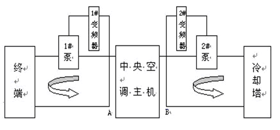 中央空調(diào)系統(tǒng)通常分為冷凍(媒)水和冷卻水兩個系統(tǒng)(如下圖,左半部分為冷凍(媒)水系統(tǒng),右半部分為冷卻水系統(tǒng))。根據(jù)國內(nèi)外新資料介紹,并多處通過對在中央空調(diào)水泵系統(tǒng)進行閉環(huán)控制改造的成功范例進行考察,現(xiàn)在水泵系統(tǒng)節(jié)能改造的方案大都采用變頻器來實現(xiàn)。