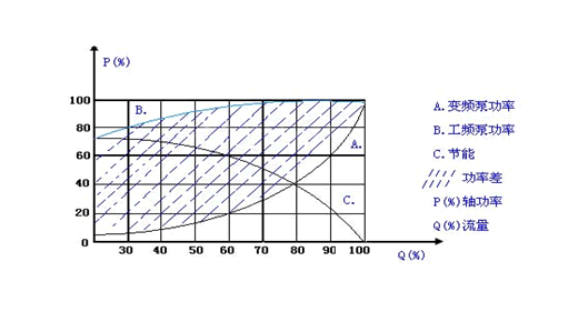 圖中陰影部分為同一臺水泵的工頻運行狀態(tài)與變頻運行狀態(tài)在隨著流量變化所耗功率差。