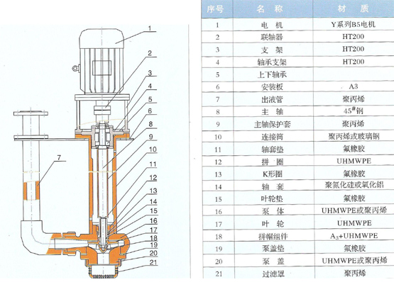 FYS耐腐耐磨液下泵為單級單吸立式泵。主要零部件有電機、電機支架、軸承架、底板、中間接管、泵軸、葉輪、泵體、出液管等。軸承為滾動軸承,采用油脂潤滑,用戶只要根據(jù)根據(jù)工藝選擇相應插入深度的泵,直接插入液體槽灌內,接上電源按照指定方向(切勿反轉)運轉即可。