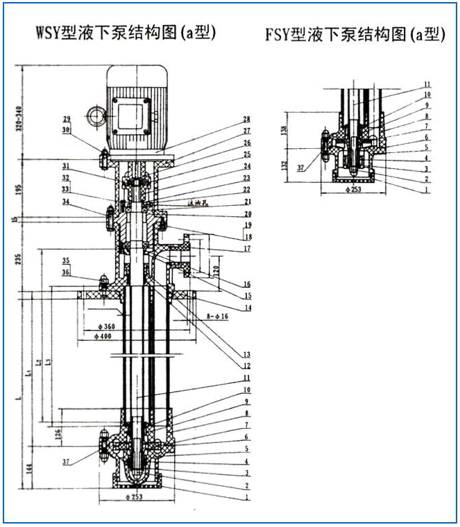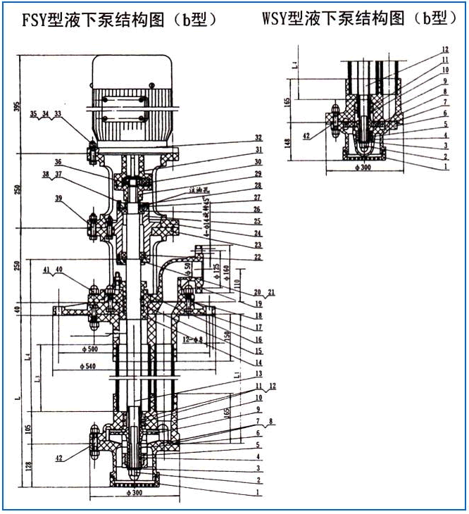 WSY型、FSY型兩種型式的泵,1.WSY型泵為立式玻璃鋼液下旋渦泵。2.FSY型泵為立式玻璃鋼液下離心泵,該泵因伸入貯罐,貯槽的深度長短不同,設(shè)計(jì)液下深度800mm--3000mm之間任意選擇。只要液體高于泵體,即可不灌液而起動(dòng)送液,平蓋板下設(shè)有泄漏孔,液體不會(huì)向貯罐外泄漏。