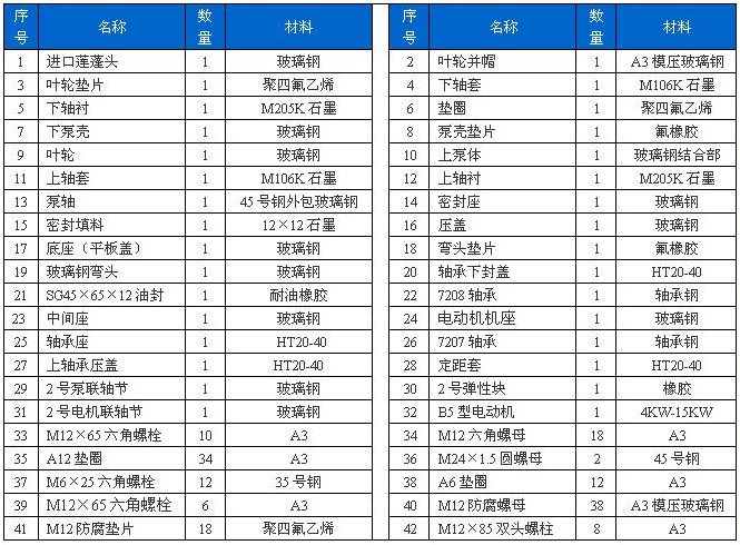 本泵與介質(zhì)接觸的零部件,系用聚乙烯醇縮丁醛改性酚醛玻璃纖維,經(jīng)高溫模壓成型的酚醛玻璃鋼制件,聯(lián)接管、出液管采用半干法卷制工藝制成的酚醛玻璃鋼管,葉輪軸套的裝配均用酚醛膠泥和泵軸粘成一體,液下各部裝配均用酚醛膠泥粘結(jié),伸入液下全無金屬與介質(zhì)接觸,耐腐性能絕對(duì)可靠,產(chǎn)品具有輕質(zhì)、高強(qiáng)、不變形、耐溫、耐腐蝕等優(yōu)良性能,在防腐方面可部分替代含鉬不銹鋼、鈦及鈦合金等貴重金屬。