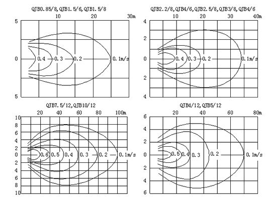潛水?dāng)嚢铏C(jī)的選型是一項比較復(fù)雜的工作,選型的正確與否直接影響設(shè)備的正常使用,作為選型的原則就是要讓潛水?dāng)嚢铏C(jī)在適合的容積里發(fā)揮充分的攪拌功能,一般可用流速來確定。根據(jù)污水處理廠不同的工藝要求,潛水?dāng)嚢铏C(jī)佳流速應(yīng)保證在0.15~0.3m/s之間,如果低于0.15m/s的流速則達(dá)不到推流攪拌效果,超過0.3m/s的流速則會影響工藝效果且造成浪費(fèi)。所以在選型前首先確定QJB潛水?dāng)嚢铏C(jī)運(yùn)用的場所,如:污水池、污泥池、生化池;其次是介質(zhì)的參數(shù),如:懸浮物含量、粘度、溫度、PH值;還有水池的形狀、水深甚至安裝方式等都對選型產(chǎn)生影響,同時還應(yīng)考慮到節(jié)能因素,因為這將影響到用戶今后的運(yùn)行成本。可參考下面的潛水?dāng)嚢铏C(jī)流場圖。